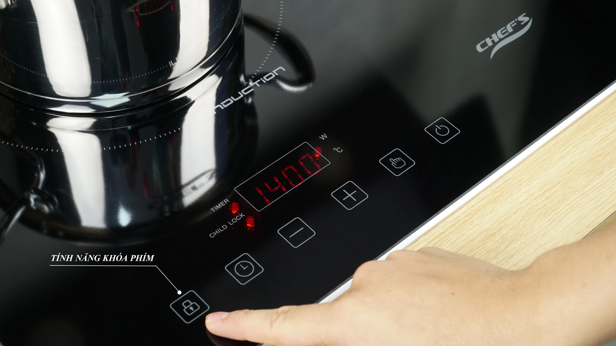 Khóa an toàn Child Lock: Nhấn vào phím khóa 3s để kích hoạt tính năng khóa. Lúc này, các phím trên bếp sẽ bị vô hiệu hóa (chỉ mở nút nguồn và Khóa), người khác, đặc biệt là trẻ em khi vô tình chạm vào bàn phím bếp cũng sẽ không làm thay đổi các chương trình nấu đã được cài đặt. Giữ vào phím khóa 3s để mở lại.