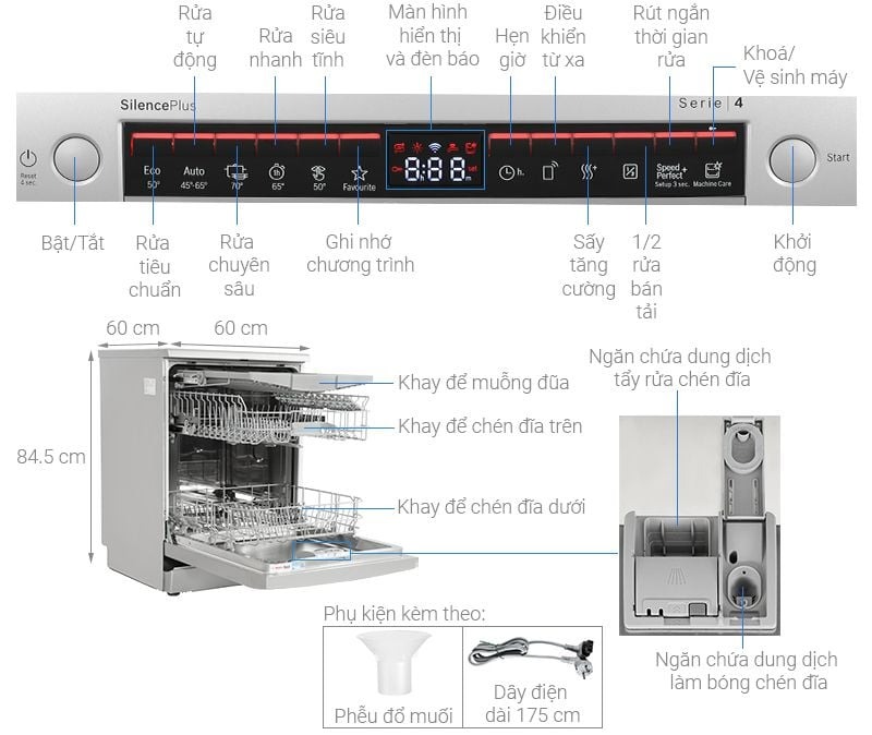 Giỏ đựng linh hoạt Vario Chức năng vệ sinh máy Machine care Chức năng tăng tốc độ rửa SpeedPerfect Chức năng hẹn giờ (từ 1 – 24 tiếng) Bán tải Half load Đèn LED báo hết muối, hết nước làm bóng AquaSensor – Cảm biến nước |